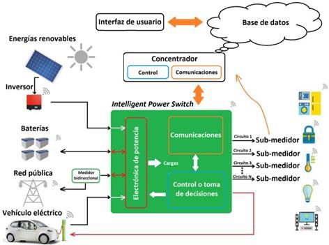 La Figura 5 se presenta un sistema de gestión que integra el conmutador inteligente de potencia y la sub- medición por circuito. Se observa que el IPS es un dispositivo que puede re-direccionar el flujo de energía eléctrica de un puerto a otro, y respecto a su funcionamiento, actúa como un enrutador de energía eléctrica por medio de su etapa de potencia. Además, está equipado con una etapa de control, otra de comunicación inalámbrica y/o cableada y como se muestra en la Figura 5, es posible conectarlo con diferentes fuentes de energía (incluidas las fuentes renovables), electrodomésticos inteligentes, almacenamiento de energía, medidores inteligentes y también otros IPS.
