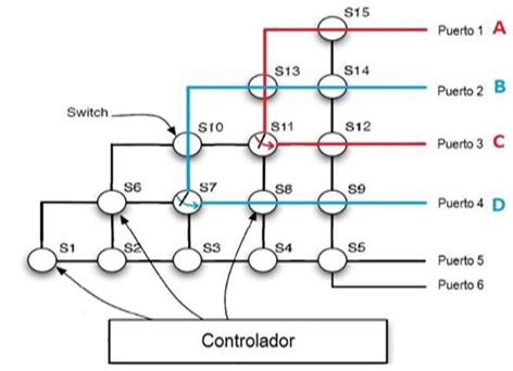 El propósito de un IPS es conmutar la energía eléctrica de un puerto a otro, es decir que cualquier componente conectado al IPS puede estar conectado otro, o al mismo tiempo múltiples puertos pueden ser conectados juntos [30]. Esto significa que, si se tienen dos fuentes de energía eléctrica, A y B, y dos cargas eléctricas, C y D, A puede proveer energía eléctrica a C y B puede suministrar energía eléctrica a D paralelamente. Para lograr este objetivo, el IPS usa el diseño presentado en la Figura 6, en el cual son utilizados quince interruptores para controlar seis puertos [30].