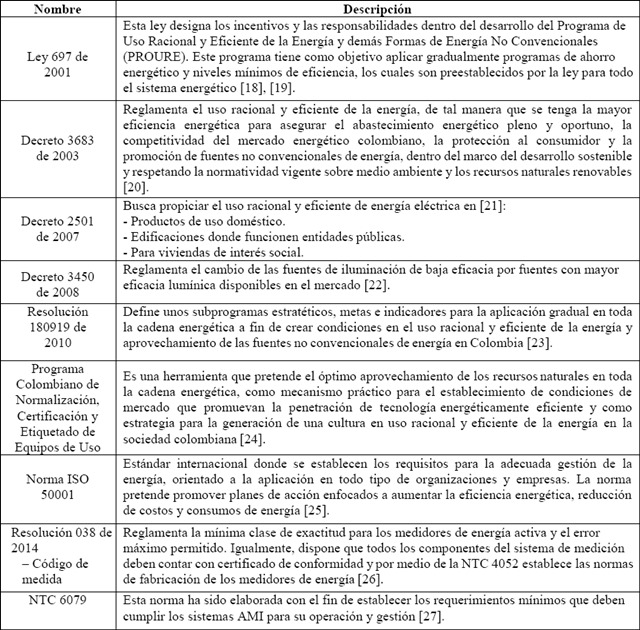 En la Tabla 1 se presentan otras normativas que han permitido la evolución del contexto legal, normativo y reglamentario colombiano encaminado a la gestión, eficiencia y uso racial de la energía eléctrica.