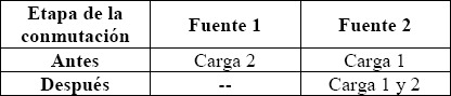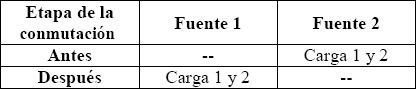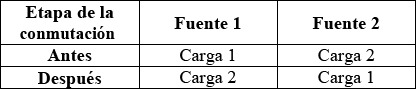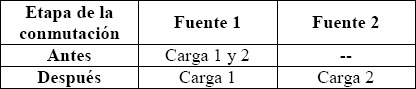 En la Tabla 3. se muestra el patrón de conexión utilizado, mostrando que antes de la conmutación cada una de las cargas está alimentada por fuentes independientes y como después de la conmutación las dos cargas pasan a ser alimentadas de forma simultanea por una sola fuente.