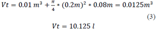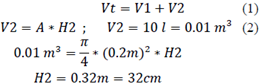 Ahora, teniendo en cuenta un factor de seguridad (Fs) de 0.25, en referencia a la altura anterior para el volumen inicial de 10 L, se obtiene que H1=8cm. Dicho lo anterior Ht = 8cm + 32cm = 40cm.