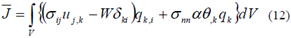 Donde W es la densidad de energía de deformación, qk es una función auxiliar y qk,i es la derivada parcial de q con respecto a la coordenada i.