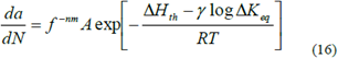 donde dα/dN es la velocidad de crecimiento de grieta, f es la frecuencia de la carga, ΔHth es la energía de activación aparente (independiente de ΔK), ΔK es el rango de intensidad de esfuerzo, R la constante universal de los gases (=8,31 J/mol K) y T la temperatura absoluta.