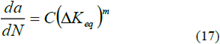 La evaluación computacional de la velocidad de crecimiento de grieta por fatiga se obtuvo luego de calcular el rango del factor de intensidad de esfuerzo equivalente ΔKeq, a través de la ecuación (14) y con base en unas condiciones de temperatura y frecuencia de carga específicas. Para el cálculo de esa velocidad se utilizó el modelo de Kim y Wang [5], descrito a continuación: