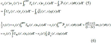 La aplicación del MDEC a problemas de fractura termoelásticos requiere las ecuaciones integrales de contorno, las ecuaciones de Laplace (1) y de Navier (2). De acuerdo con el trabajo de Dell'Erba [15], las ecuaciones integrales que relacionan la temperatura θ(x) y flujo de calor q(x) en el contorno Γ(x) son