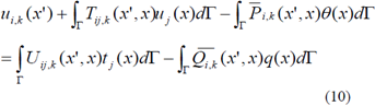 donde uj y t¡ representan los valores de desplazamiento y tracción en el contorno, respectivamente. Uij (x', x) y Tij(x',x)' son las soluciones fundamentales de Kelvin y Pi(x',x) y Qi (x',x) son las soluciones fundamentales obtenidas al reducir las fuerzas de origen térmico del volumen al contorno.