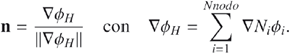 Esto permite también calcular el vector normal unitario a la interfase, en un punto P є α interior a un elemento Ωi: