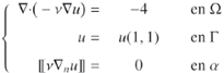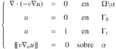 Se debe resaltar que, la solución de la ecuación posee una característica de discontinuidad del gradiente sobre la zona de la interfase, es por esto que dicha ecuación diferencial no está definida sobre la interfase por no tener sentido en esos puntos donde el parámetro v es discontinuo. Sin embargo, sobre la interfase se ha de verificar la continuidad de la componente normal del flujo, lo cual se obtiene con la última condición impuesta al problema (1). Además, a mayor diferencia entre los valores de v1 y v2, mayor será el salto del gradiente; por ello la discontinuidad del gradiente (en la dirección normal a la interfase) es un rasgo característico que posee la solución exacta del problema que se está estudiando, y por tanto, cualquier aproximación debería contener esta propiedad.