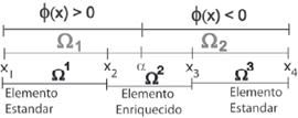 Recuerde que el dominio Ω se divide en dos subdominios Ω1 y Ω2. A los elementos Ωi de la malla de elementos finitos, que contienen la interfase en su interior, se les llamará elementos enriquecidos, y a los demás elementos estándar (ver Figura 3).