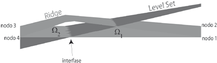 Es de acotar que esta función se anula por completo sobre los elementos estándar de la malla; y en los elementos enriquecidos, se anula solo en los nodos, además presenta una discontinuidad del gradiente, exactamente sobre la interfase (Ver Figura 4), lo cual es exactamente el comportamiento de la solución analítica del problema. Por ello, la necesidad de introducir esta función para enriquecer el espacio de las funciones de forma, y así obtener una solución mucho más cercana a la exacta.