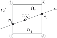 donde P1y P2 son los puntos de intersección entre la interfase α y los lados del elemento enriquecido Ωk (Figura 5).