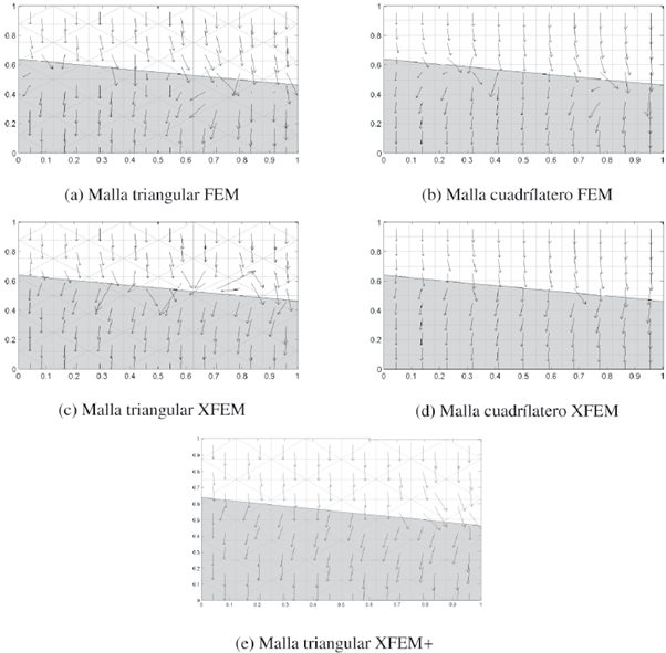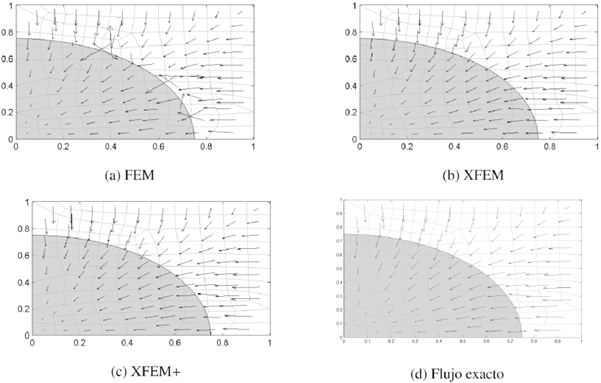 Sin embargo, es de acotar que, al utilizar elementos cuadriláteros, se está aumentando el orden de la aproximación (de funciones lineales a funciones cuadráticas), por ello, el XFEM con cuadriláteros tiene menores errores en la aproximación de flujos globales a comparación con el XFEM con elementos triangulares. Finalmente, esta incapacidad de XFEM de reproducir con exactitud los flujos locales, se debe a que, la condición