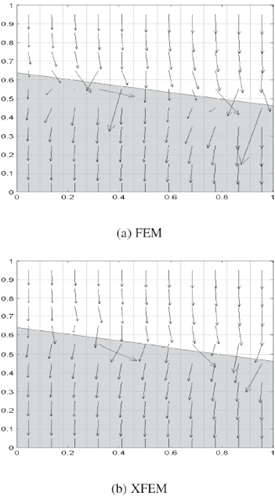 El FEM no puede satisfacer la condición de continuidad del flujo normal en los puntos de la interfase, ya que el gradiente es continuo en el interior de los elementos. Sin embargo, en la implementación numérica de XFEM, se observa un fenómeno: a pesar de la capacidad que tiene el método para capturar el salto del gradiente, cuando los parámetros v1 y v2 son altamente distintos, el método es poco preciso y arroja una solución no tan buena de la aproximación del flujo en la zona cercana a la interfase.