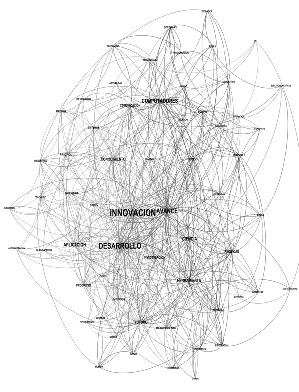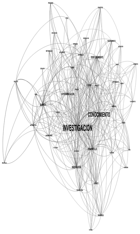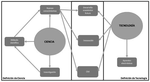 En cuanto a ciencia, los encuestados la perciben como un fenómeno teórico y experimental que se elabora en el laboratorio y donde priman el conocimiento y la investigación experimental (Figura 1). De esta manera, existe un núcleo representativo claro (Investigación) que evidencia un consenso sobre este tema, lo cual parece estar relacionado con el concepto heredado de la ciencia[11]. Por su parte, la tecnología (Figura 2) se configura como un concepto menos compacto que el anterior, lo que evidencia la ausencia de un núcleo representativo claro y un menor consenso al respecto. En ese orden de ideas, se le identifica como un conjunto de herramientas (concepción artefactual de la tecnología) que están asociadas al desarrollo económico y social (determinismo tecnológico), y que permiten transmitir información y conocimiento. De tal forma, este concepto se enmarca dentro de la concepción artefactual de la tecnología (en la que esta se considera como un objeto) [11], el determinismo tecnológico (la tecnología define cómo actuará la sociedad) [12] y la sociedad del conocimiento [13]. Por tanto, esta concepción se basa en la definición restringida de tecnología propuesta por Pacey [14], debido a que en esta "solo se hace referencia al aspecto técnico, conocimiento, destreza y técnica, herramientas, máquinas o recursos" [11], la cual es la característica principal de las concepciones intelectualista y artefactual de la tecnología.