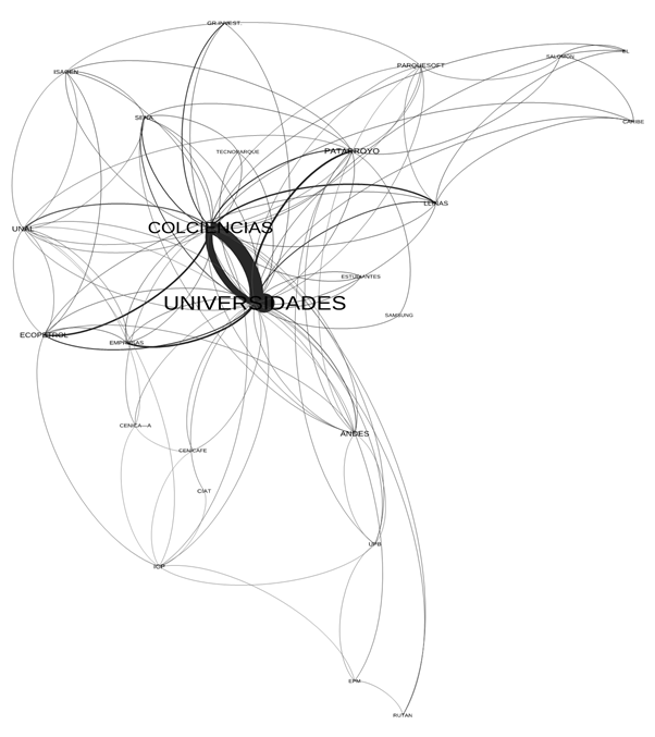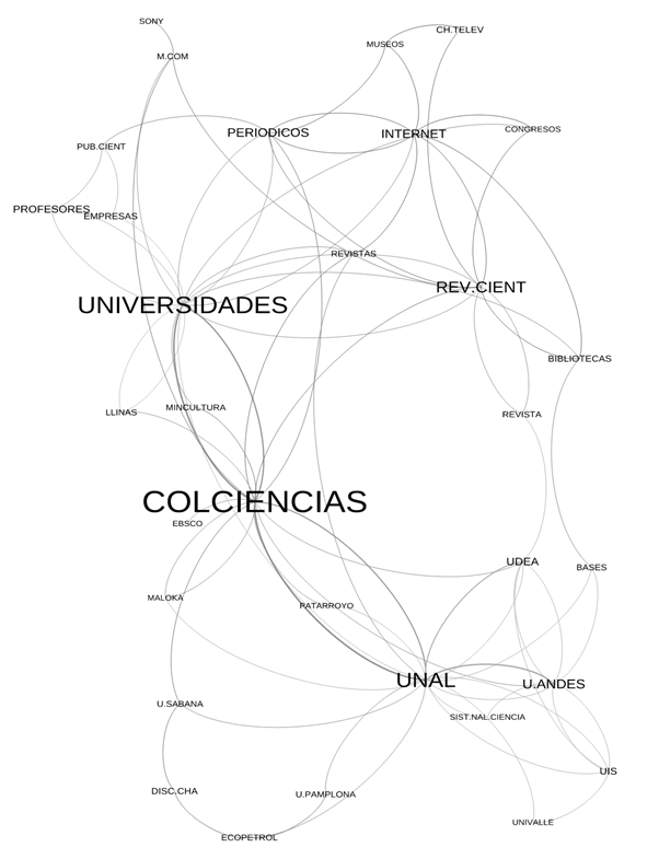 Por otra parte, los encuestados conciben los productores de CyT a instituciones tales como las Universidades o el Instituto Colombiano del Petróleo como nodos de asociación principales. Sin embargo, esta misma población menciona más frecuentemente a la Universidades (43,8 %) y al Departamento Administrativo de Ciencia y Tecnología (Colciencias) (24,4 %) como las instituciones más cercanas a este proceso. En general, para los participantes, la CyT colombianas se producen perceptivamente de forma más cercana a acciones generadas por los grupos de investigación de las IES. Asimismo, se vincula esta producción a algunos centros de investigación y a programas especiales de ciencia, tecnología e innovación (Figura 3). En tanto los divulgadores de CyT son asociados con mayor frecuencia con Colciencias (29,0 %) y las universidades (20,1 %) y las revistas científicas. No obstante, como nodos de asociación, se consideran a las universidades y las revistas científicas, dadas las funciones no divulgadoras que ejerce Colciencias. De lo anterior, es posible establecer que los resultados obtenidos dependen de qué se divulgue y quién lo haga, lo cual se relaciona con cuán cercano está el encuestado, hacia la educación formal recibida en las instituciones de educación superior (IES) (Figura 4).