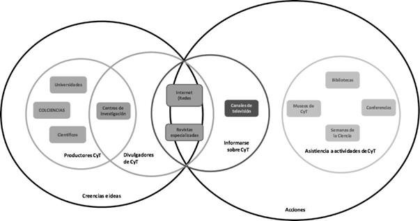 Por su parte, la producción y divulgación científica y tecnológica están visibilizadas desde la perspectiva de que ciertas instituciones (universidades, centros de investigación o el Departamento Administrativo de Ciencia, Tecnología e Innovación, Colciencias), científicos reconocidos (médicos colombianos, principalmente) o las redes sociales son quienes realmente influyen en estos procesos. Igualmente, la gran mayoría de los encuestados identificaron a Colciencias como institución productora de CyT en el país, a sabiendas que es el organismo gestor de la CyT bajo el marco de Sistema Nacional de Ciencia, Tecnología e Innovación, más no un organismo que se enfoca directamente en la producción científica y tecnológica. Por otro lado, frente a la divulgación científica y tecnológica, es notoria la relación entre la edad de los encuestados y su actividad -estudiante, graduado o docente/directivo-, lo cual mostró cómo es la percepción de los encuestados según el grupo al que pertenecen. Así, por ejemplo, al tener una edad mayor y ser docente o directivo se concibe la divulgación escrita en revistas especializadas como una forma importante de divulgación científica y tecnológica, mientras que al ser menor y estudiante las redes sociales son la forma más importante para divulgar la CyT.