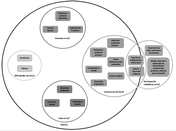 Por otro lado, al valorar a la CyT desde la perspectiva de las dificultades que tienen estas para ser desarrolladas en el país, se observó que los encuestados manifiestan que la mayoría de estas se encuentran fuera de la academia y que se relacionan con situaciones políticas y económicas "ajenas". De tal forma, basado en la conclusión de que los encuestados consideran a la CyT como procesos individuales mediados por el conocimiento adquirido a través del método científico y de los científicos dentro de los laboratorios, se identificaron las siguientes conclusiones en cuanto a sus dificultades:
