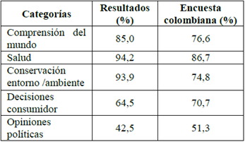 Para el 86,9 % de los encuestados la CyT son muy importantes para la innovación en las empresas, la utilización adecuada de los recursos naturales, el desarrollo económico nacional, el conocimiento y la preservación del entorno y el medioambiente, el cuidado de la salud y la prevención de enfermedades, y la comprensión del mundo. Implícitamente, la ciencia y la tecnología son vistas de suma importancia para el desarrollo y mantenimiento de la industria y el sistema económico actual [20] -lo cual estaría asociado con la percepción positiva de la CyT, observado en los anteriores apartados-. A su vez, los participantes dejan de lado la importancia de estos procesos como medios para relacionarse consigo mismo o los demás, lo cual podría relacionarse con la percepción de que la CyT asociada con sus conocimientos y metodologías son más cercanas a las ciencias naturales que a las ciencias sociales o humanas. Por su parte, en la Tabla 1 se muestra la comparación de algunos de los resultados obtenidos con aquellos de la encuesta colombiana [7] en cuanto a la importancia de la CyT para crear opiniones políticas, la toma de decisiones como consumidor, su relevancia para el campo de la salud o en la preservación del medioambiente.