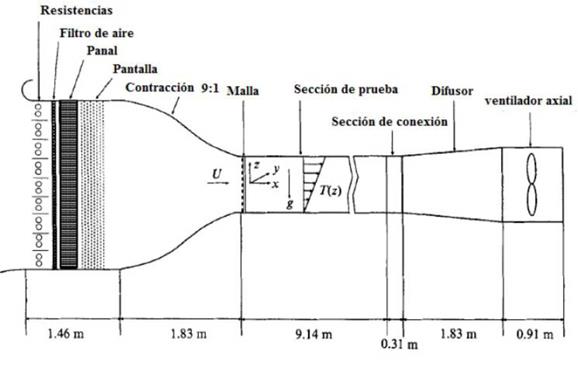 La turbulencia fue generada en un túnel de viento horizontal, de succión y de circuito abierto de 91 x91 cm2 de sección transversal y 9,14 m de longitud ubicado en la Facultad de Ingeniería Mecánica y Aeroespacial de la Universidad de Cornell, en Ithaca, Estados Unidos. Un túnel de viento de succión y de circuito abierto es aquel en que el aire se aspira directamente de la atmósfera, y después de hacerlo pasar por la sección de ensayo o prueba, se devuelve nuevamente a ella. El túnel fue diseñado inicialmente para el estudio de flujos estratificados que involucraban no solo perfiles de velocidad, sino también de temperatura [4]. Un esquema del túnel con los diferentes elementos que lo componen se proporciona en la figura 1.
