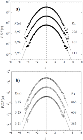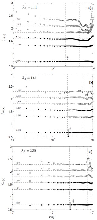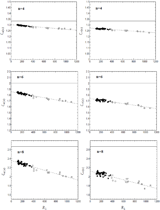 tiene una fuerte dependencia del número de Reynolds, pues los valores obtenidos para los exponentes varían significativamente entre el número de Reynolds más alto y más bajo. Se espera que cuando Rλ → ∞, el exponente