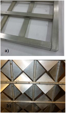 Los generadores de turbulencia pasivos son el método más simple para producir turbulencia aguas abajo en túneles de viento. Una malla pasiva consiste en un arreglo de barras cilíndricas o planas que forman una sección cuadrada. La malla pasiva usada en las mediciones estaba compuesta por 8 barras planas horizontales y 8 barras planas verticales de aluminio, con un espesor de 19 mm unidas a un marco, figura 2a. Las barras están separadas por una distancia de 8,26 cm, horizontal y verticalmente, lo que produce una separación entre los puntos medios de cada barra, M, de 10,16 cm. Una malla activa es un generador de turbulencia que utiliza elementos activos para producir turbulencia. La malla activa estilo Makita [2] es un conjunto de 100 alas cuadradas acopladas a una malla de barras redondas. Las barras cilíndricas son accionadas por motores paso a paso (200 pasos por revolución) en una secuencia aleatoria para crear una distribución de obstrucción transitoria en la sección de entrada de prueba del túnel de viento. La malla activa está compuesta por 8 barras horizontales y 7 barras verticales de aluminio con un diámetro de 12,7 mm unidas a un marco a través de rodamientos de baja fricción, figura 2b.