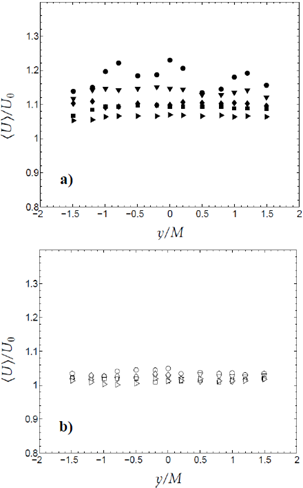 Para las mediciones con malla activa no hubo problemas de homogeneidad en los perfiles transversales de la velocidad media, porque las mediciones se realizaron a mayores distancias de la malla. La relación 〈U〉/𝑈0 fue muy similar en las cinco posiciones x/M medidas en cada velocidad. Para la posición x/M=45,97 esta relación tendió a 1,26, 1,08 y 1,01 para las velocidades U0 de 3, 6 y 9 m/s, respectivamente, lo que indicó que cuanto mayor fue í/0 más cercano fue 〈U〉/𝑈0, a la unidad, que es el valor esperado para la turbulencia homogénea. Para la malla activa se puede asegurar que por los valores de 〈U〉/𝑈0 se está siempre ante un flujo homogéneo, mientras que para la malla pasiva se requiere que el valor de x/M sea mayor de 19,75.