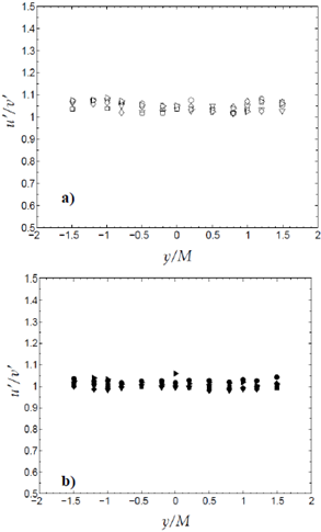 La figura 5 muestra el factor de isotropía como función de la posición transversal y para ambos tipos de malla. El factor de isotropía fue de aproximadamente 1,05 para la malla pasiva y de 1,11 para la malla activa, que son valores muy cercanos a los valores de referencia. Este factor disminuyó al aumentar U0 y fue constante en todo el rango de medición, lo que indica que es independiente de la posición x/M.