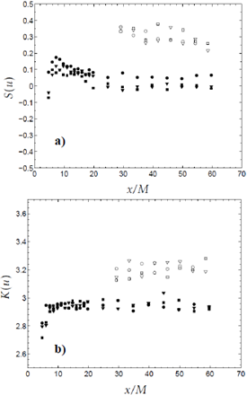 La asimetría puede tomar valores positivos y negativos, pero, de acuerdo con los experimentos observados en turbulencia, la asimetría debe ser negativa [13] [14], porque representa un proceso de transferencia de energía. La figura 6 muestra la evolución longitudinal de la asimetría y la curtosis de la velocidad longitudinal en el centro del túnel (y/M = 0).