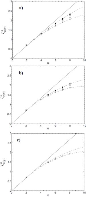 ; y la función de estructura para la velocidad longitudinal, u, medida con separaciones en dirección transversal al flujo, y, que se calcula mediante la ecuación 〈Δu(y)n〉 = 〈(u(y + r) −u(y))n〉, y que también tendrá una serie de valores propios para los exponentes de escala,