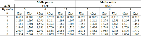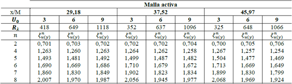 De acuerdo con los perfiles de velocidad media, del factor de isotropía, de la asimetría y la curtosis, el flujo fue considerado razonablemente homogéneo e isotrópico para posiciones x/M > 19,75 en malla pasiva y x/ M>29,18 en malla activa. La tabla 1 muestra los principales parámetros del flujo para diferentes posiciones x/M y diferentes velocidades U0 para ambos tipos de malla.