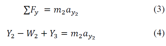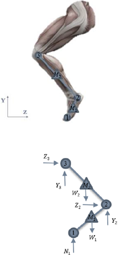 La cadena cinemática está compuesta por dos (2) eslabones rígidos que representan el pie y la pierna, respectivamente, con mecanismos de unión tipo pin en cada una de las articulaciones, es decir, en el tobillo y la rodilla. Para el estudio dinámico se toma como punto de referencia global un centro de rotación sobre el eje perpendicular al plano sagital ubicado en la punta del pie y los marcos de referencia locales en cada una de las articulaciones (véase figura 1).