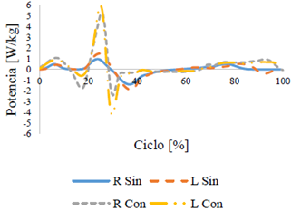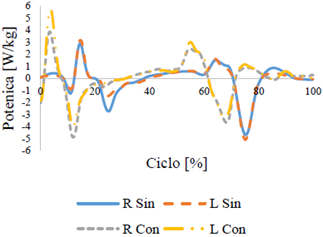 El análisis de potencia se normalizó respecto al peso de cada participante [W/kg]. Los resultados se presentan a continuación: