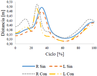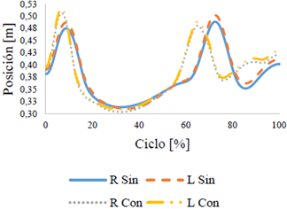 En primera instancia, se observa la posición obtenida por la rodilla en el plano-y del eje sagital del cuerpo, respecto a un marco de referencia global, durante el movimiento con y sin el uso de la barra para cada uno de los sujetos de prueba. En esta se puede observar la técnica realizada por la persona de estudio durante un ciclo (véase figura 4). El ciclo se basa en la diferencia de técnica presentada en el estudio de V. Gourgoulis [5], el cual divide el movimiento en primer halón, segundo halón, atrape y ascenso. Asimismo, se observa la diferencia entre la similitud del movimiento entre la extremidad derecha e izquierda y la comparación entre las dos participantes.