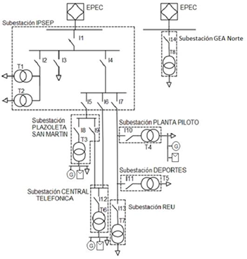 Como se puede apreciar en la descripción de las subestaciones, las potencias de estas son bastante diferentes, debido a la discrepancia en las cargas que alimenta cada una y a su ubicación con respecto a los centros de carga. El diagrama unifilar simplificado de la UNRC se muestra en la figura 3, en la que se observan los puntos de acoplamiento de los generadores distribuidos (GD).