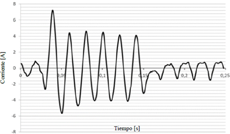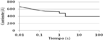 La figura 8 muestra la corriente de una falla típica de un sistema con una penetración del 25 %, donde varía gradualmente la corriente por existencia de generadores rotativos y dos escalones debidos a la limitación del conversor de una fuente fotovoltaica (50 % en 1 s). Luego se desconecta el generador rotativo a los 2 segundos, y posteriormente se mantiene constante en 400 A por el aporte conjunto de la red y de la celda PV. Las corrientes de falla son dependientes, en magnitud y declinación, del tipo de GD utilizado, de modo que varían desde valores tan altos como 10 a 12 veces la corriente nominal para generadores sincrónicos a valores del orden de la corriente nominal y aún menores para el caso de celdas fotovoltaicas.