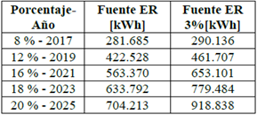 De acuerdo con la reglamentación nacional previamente descrita, la energía de origen renovable consumida por la Universidad debe ser del 8 % al 31 de diciembre de 2017, aumentar al 12 % para el 31 de diciembre de 2019, y así sucesivamente. Lo anterior se refiere a los consumos de la Institución, de 3'521.064 [kWh] anual, con un promedio mensual de 293.422 [kWh], y considerando un incremento anual de energía consumida del 3 %. Los valores quedan expresados en la tabla 1.