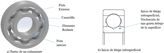 La fatiga de contacto rodante en la superficie y la fatiga subsuperficial son dos formas de fallas típicas de los rodamientos, ambos se deben a los esfuerzos de contacto que se presentan en la rodadura. La primera es una falla que comienza en la superficie y que se propaga por el efecto de paso continuo de los elementos rodantes, la segunda es una falla iniciada por debajo de la superficie donde los esfuerzos de contacto tangenciales son máximos y los esfuerzos cíclicos causan el crecimiento de la grieta hasta el exterior de la superficie. Desde ahí la grieta crece hasta generar el desconchado de la superficie, y crecerá por el paso continuo de los elementos rodantes (véase figura 1b).