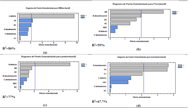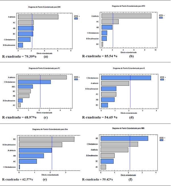 En Figura 8 se relacionan los diagramas Pareto, obtenidos para los efectos de los factores en las variables respuesta, y se relaciona el R2 del modelo. El desbalanceo afecta los valores globales de envolvente de aceleración disminuyéndolos, y para los valores de HFD el desbalanceo tienden a aumentar estos valores.