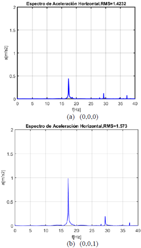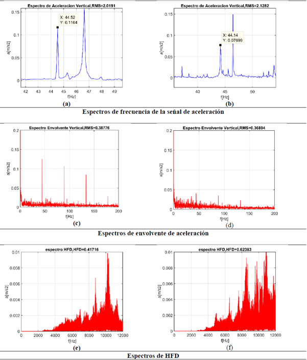 En los espectros de frecuencia de la onda de aceleración pueden identificarse las frecuencias de falla de los componentes de los rodamientos. Además, se puede realizar el seguimiento del incremento de las amplitudes en estas frecuencias específicas, para hacer seguimiento del aumento en la severidad de la falla [14], [15].