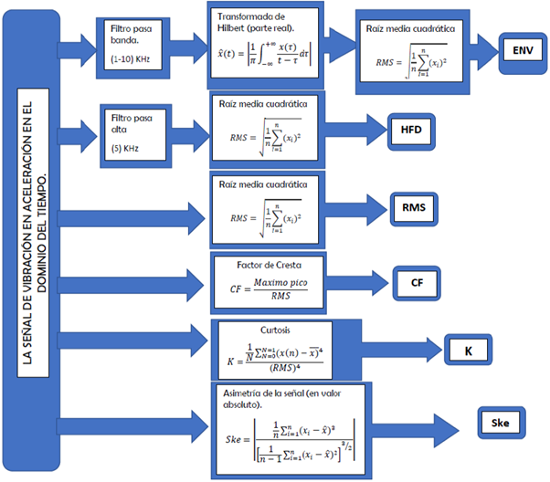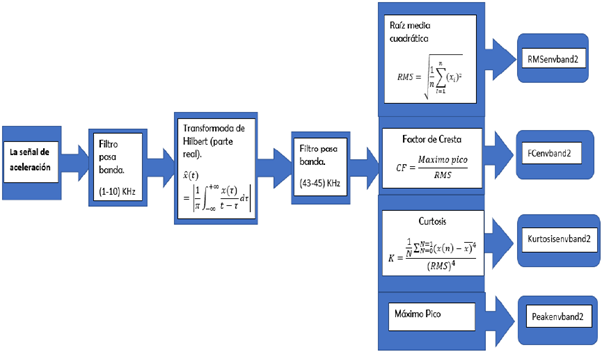 Peackenvband2 = valor máximo del pico de la envolvente de aceleración, filtrando la señal cerca a la frecuencia del defecto. Véase en la figura 8 el proceso de obtención matemática de esta variable.