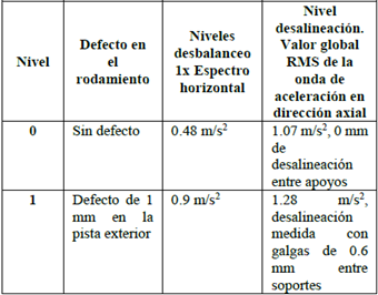 Para este experimento el tamaño de defecto alto se tomó de 1 mm, el nivel de desbalanceo alto se eligió poniendo peso en la polea, de forma que en los espectros en dirección vertical se evidenciara un incremento en la frecuencia fundamenta 1X de más del doble (véase figura 4). Para el nivel alto de la desalineación se desalinearon los soportes hasta incrementar la vibración global axial entre un 10 y 12 %.