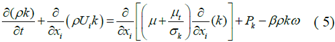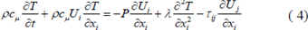 El primer término de la Ecuación (4) representa el cambio de energía local con el tiempo; el segundo es el término convectivo; el tercero corresponde al trabajo de presión, seguido del término de difusión de flujo de calor, y, finalmente, la transferencia irreversible de energía mecánica en calor.