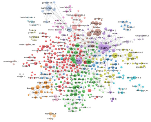 Dentro de la estructura de esta red, resalta la posición central del profesor Rao I., quien, junto con los autores Blair M. y Beebe S. conforman el cluster con mayor influencia dentro de la red (color violeta), debido a su productividad (cantidad de documentos) e impacto (número de citas).