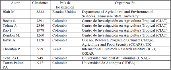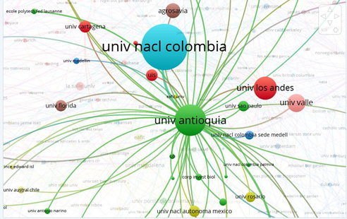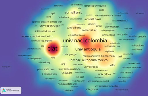 Las filiaciones institucionales más frecuentes dentro del grupo de 10 autores muestran al Centro Internacional de Agricultura Tropical (CIAT) y al Science for humanity's greatest challenges (CGIAR) como las organizaciones con mayor influencia dentro de esta red de investigación. Dentro de las universidades colombianas, resaltan la Universidad Nacional de Colombia y la Universidad de Antioquia como las organizaciones con mayor productividad, impacto y nivel de capital social representado en número de vínculos dentro de la muestra.