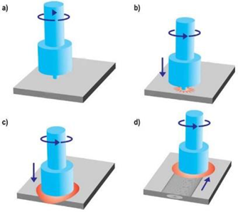 Los problemas asociados al cambio de estado motivan la búsqueda de alternativas en estado sólido. Friction stir processing (FSP) es una tecnología nacida del proceso FSW, con la finalidad de modificar las propiedades superficiales de un material, mediante la eliminación de defectos puntuales de fundición y el refinamiento de la microestructura local [5], [6]. De acuerdo con Sharma et al., el proceso FSP consiste en el uso de una herramienta rotatoria no consumible que se introduce en una pieza de trabajo y avanza en una dirección de interés [3]. En la figura 1 se presenta un esquema con las etapas generales del proceso.