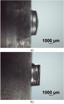 Para el proceso de fabricación de MMC superficial se empleó un centro de mecanizado FIRST MCV1100 y dos herramientas de hombro cóncavo de 20 mm y pin de 5 mm de diámetro y 2 mm de longitud. La herramienta 1 cuenta con un pin cilíndrico roscado. La herramienta 2 cuenta con un pin cilíndrico roscado con 4 lados facetados. La función de la herramienta 1 es introducir el material particulado, mientras que la herramienta 2 tiene la función de distribuir las partículas la superficie. En la Figura 4 se pueden observar imágenes tomadas con el estereoscopio Nikon SMZ1000 de los pines de las herramientas.