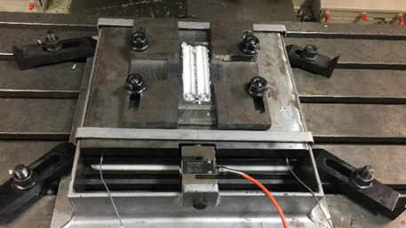 Cada platina se procesó a 1000 rpm de velocidad de giro, 100 mm/min de velocidad de avance, 30 mm/min de velocidad de ingreso de cada herramienta, 15 s de dwell time, y se realizaron dos pasadas de inserción (herramienta 1). Se definió como parámetro diferenciador el número de pasadas de distribución (herramienta 2). En la tabla 2 se pueden observar la nomenclatura de los cordones y los parámetros usados. El montaje empleado se observa en la Figura 5.