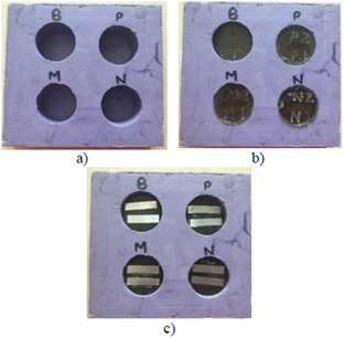 Mediante la técnica de corte por chorro de agua se obtuvieron muestras de las regiones procesadas, denominadas P1, P2, M1, M2, N1 y N2 y muestras del material base tanto transversal (T) como longitudinal (L) a la dirección de laminación. Se fabricó un molde en silicona para el montaje de muestras en parejas (M1 y M2, N1 y N2, P1 y P2, L y T) en probetas de una pulgada de diámetro por una pulgada de altura (Figura 6a).