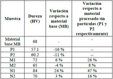 El material base presenta una dureza alrededor de 68 HV[8], [9], consistente con reportes encontrados en otras publicaciones [7]-[9]. Como se puede observar en la Tabla 3, las muestras procesadas presentaron una disminución en la dureza respecto al material base entre el 11 y el 16 %, mientras que las muestras M1 y N1 (ambas con 2 pasadas de distribución) presentaron un incremento en la dureza 6 y el 20 % respectivamente. Sin embargo, al incrementar a 4 pasadas con la herramienta 2 (muestras M2 y N2) la dureza medida se redujo hasta alcanzar resultados cercanos al material base, para poder concluir al respecto, es necesario realizar pruebas de caracterización microestructural más detalladas; esta disminución puede asociarse a procesos de recristalización por aumento de temperatura durante el procesamiento. Además, se puede observar que las muestras procesadas con partículas (M1, M2, N1 y N2) obtuvieron un aumento de la dureza del 8 % al 47 % respecto a las muestras procesadas sin partículas respectivamente, lo que permite inferir que en la zona del nugget de estas cuatro muestras se encuentran partículas de alúmina.