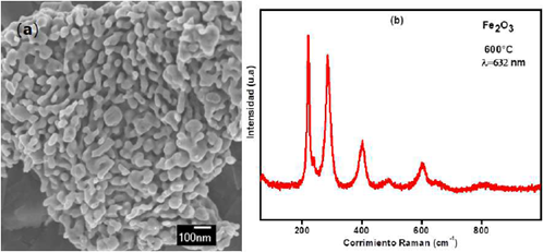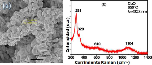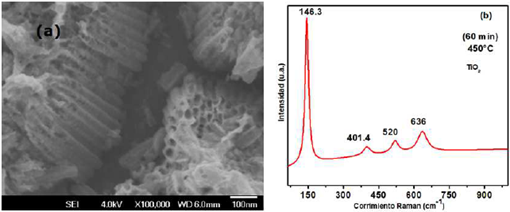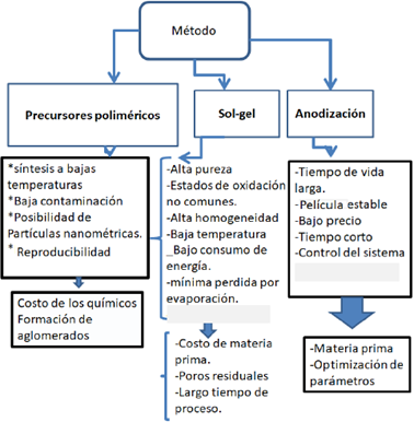 En la figura 1(a), se observa los resultados de las medidas realizadas sobre una muestra de T/O2, obtenida por el método de anodización. La muestra fue sometida a 20 V, durante 60 minutos. Luego, la muestra fue sometida a una temperatura de calcinación de 4500C. En esta medida de Microscopía Electrónica de Barrido con cañón de emisión de campo (MEB - FEG) del material nanoestructurado. En esta muestra se observa que los nanotubos de T/O2, tiene más de 300nm de largo y menos de 50nm de diámetro. Como se puede apreciar la morfología de la muestra, creció homogéneamente. La espectroscopia Raman es una herramienta poderosa y prometedora en el estudio de las microestructuras de los nanotubos de T/O2. Todos los espectros Raman medidos a temperatura ambiente en la muetras de T/O2 son asignados a la fase anatasa del dióxido de Titanio. Los modos vibracionales de la fase anatasa son: 144 (Eg), 197 (Eg), 399 (B1g), 513 (A1g), 519 (B1g) y 639 (Eg) cm-1 [16]. De los seis modos Raman mencionados en la literatura del material en la figura 1 (b), solamente se alcanza a observar cuatro, posiblemente los otros dos están enmascarados en los modos presentes, ya que estos se observan muy intensos. En el óxido de cobre, los patrones de DRX mostraron que los nanomateriales sintetizados estaban en una estructura cristalina monoclínica [13]. En la figura 2(a), se observa una muestra con obtenida por el método sol-gel. La muestra fue calcinada a 6500C, sin embargo como se observa en otro trabajo [13], la estructura realmente se puede obtener a 4500C, con un tamaño de partícula menor. Como se puede apreciar en la medida MEB, las nano-partículas crecieron de forma regular, sin embargo al someterla a altas temperaturas de calcinación, las nanopartículas de las muestras crecieron bastante, pero menor a un micrometro. En la figura 2(b), se observan los modos vibracionales del CuO. Como se aprecia, la estructura cristalina del material fue obtenida. Hay nueve modos de fonones ópticos de centro de zona con simetrías 4Au + 5Bu + Ag + 2Bg; solo tres modos Ag + 2Bg son Raman activos. La medida de espectrocopía Raman, se llevó a cabo a temperatura ambiente, los modos vibracionales corresponden a la estructura monoclinica del CuO. En la figura 3, presentamos la muestra de óxido de hierro he-matita, preparada por el método de precursores poliméricos (método de Pechini). El material fue precalcinado a 3000C por 2 horas y luego fue sometido a calcinación a una temperatura de 6000C. En la figura 3 (a), se observa la morfología del material. Las nanopartculas obtenidas son menores a 100nm y presentan una homogeneidad en su formación. Esto indica, que la temperatura de calcinación aplicada es la adecuada para la obtención de la muestra hematita con nanopartículas uniformes. Los espectros Raman (figura 3(b), confirman la presencia de la fase pura de Fe2O3 que es soportada por los datos de DRX[11]. Los picos a 222 y 495 cm-1 corresponde a A1g y los picos a 244, 290, 406 y 608 cm-1 corresponde a Eg de los modos vibracionales de a - Fe2O3 Con este espectro Raman, se confirma la obtención de la fase pura por este método de síntesis, sin picos adicionales [17]. El modo más intenso que se observó en la medida Raman fue en aproxidamente 222cm-1 del A1g, luego, en intensidad sigue el modo Eg en 290cm-1. Como se puede apreciar, las muestras obtenidas por este método de síntesis, son de muy buena cristalinidad. En la figura 4, se muestra un esquema general de los tres métodos de sístesis presentados en este trabajo. Uno de estos métodos de síntesis de polvos y pelculas cerámicas, que se viene popularizando es el método de los precursores poliméricos, derivado de la patentede Pechini en 1967. El método se basa en la capacidad de los ácidos orgánicos hidroxicarboxílicos formar quelatos con varios cationes. Cuando un alcohol polihidroxi se añade a este quelato, bajo calentamiento y agitación constante. A continuación, con el calentamiento y eliminación del exceso de solvente, una resina altamente viscosa se forma. Esta resina se calcina, generalmente a 3000C. Luego, se realiza el tratamiento térmico a diferentes temperaturas [18]. Generalmente, el ácido cítrico es usado como agente quelante y el etilenglicol como agente polimerizante. La anodización, es una reacción de oxidación,-disolución electroquímica proceso de síntesis sencillo, con un buen control morfológico. El proceso se utiliza para modificar la morfología superficial, de un sustrato a partir de la oxidación-disolución de una capa de óxido sobre la muestra de interés. Básicamente, consiste en dos electrodos, uno como ánodo y otro como cátodo. El proceso de síntesis se realiza en una celda electroquímica [19]. El proceso Sol-Gel, en la preparación de polvos, monolitos y filmes finos es basado en la reacción de hidrolisis polimerización de precursores alcóxidos. El proceso envuelve el uso de líquidos de baja viscosidad. El Sol es descrito, como una suspensión de partículas coloidales, en cuanto al Gel se refiriere a una masa semirrígida, se forma cuando las partículas coloidales están unidas en forma de red. La hidrolisis es la principal reacción química que conduce a la transformación de los precursores, esto es, los óxidos. La condensación es responsable por la polimerización de los precursores [20].